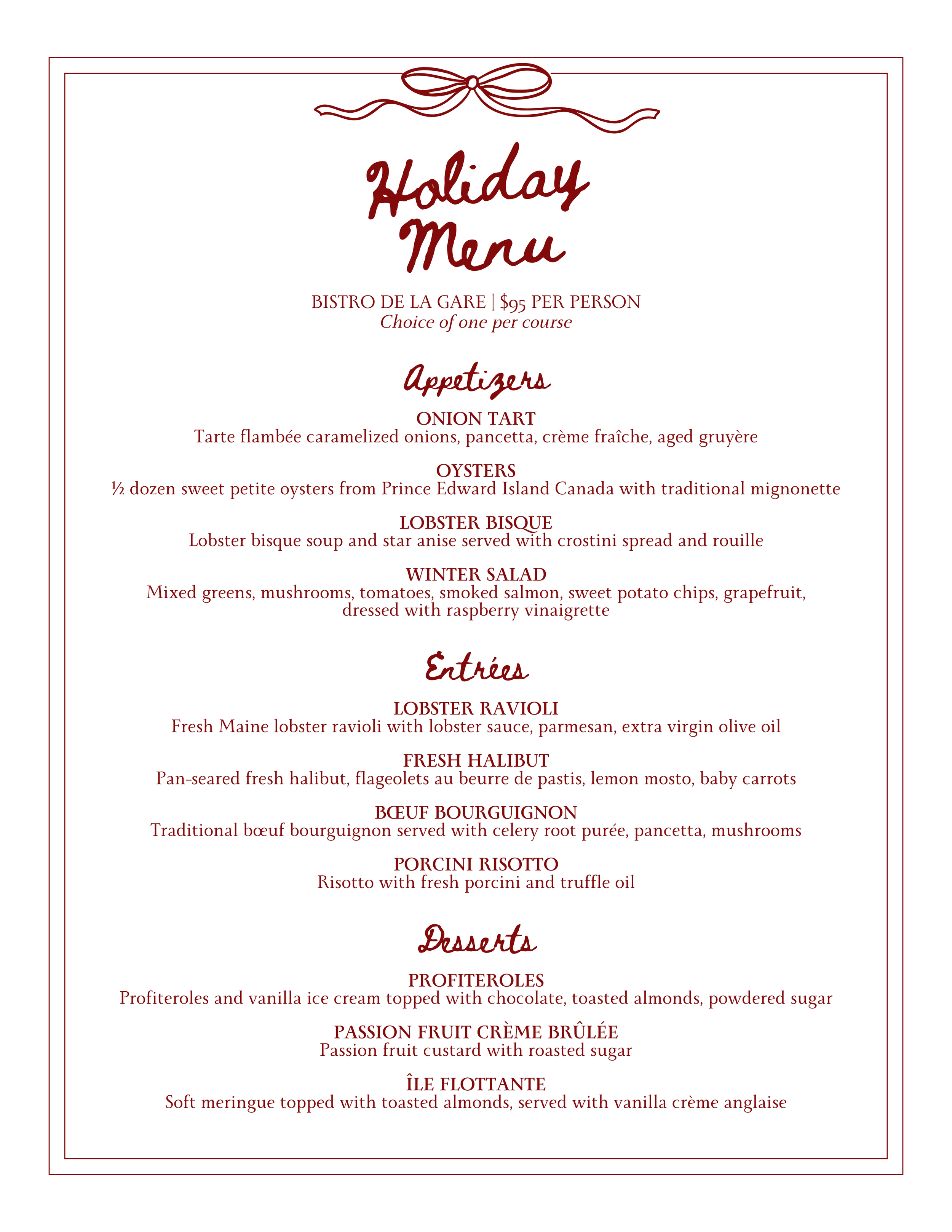 We welcome the opportunity to serve you on your special day. Consider Bistro de la Gare as a venue for your private parties and events, bridal showers, baby showers, wedding parties, corporate dinners, anniversaries, and family reunions. Custom and prix fixe menus are available upon request.